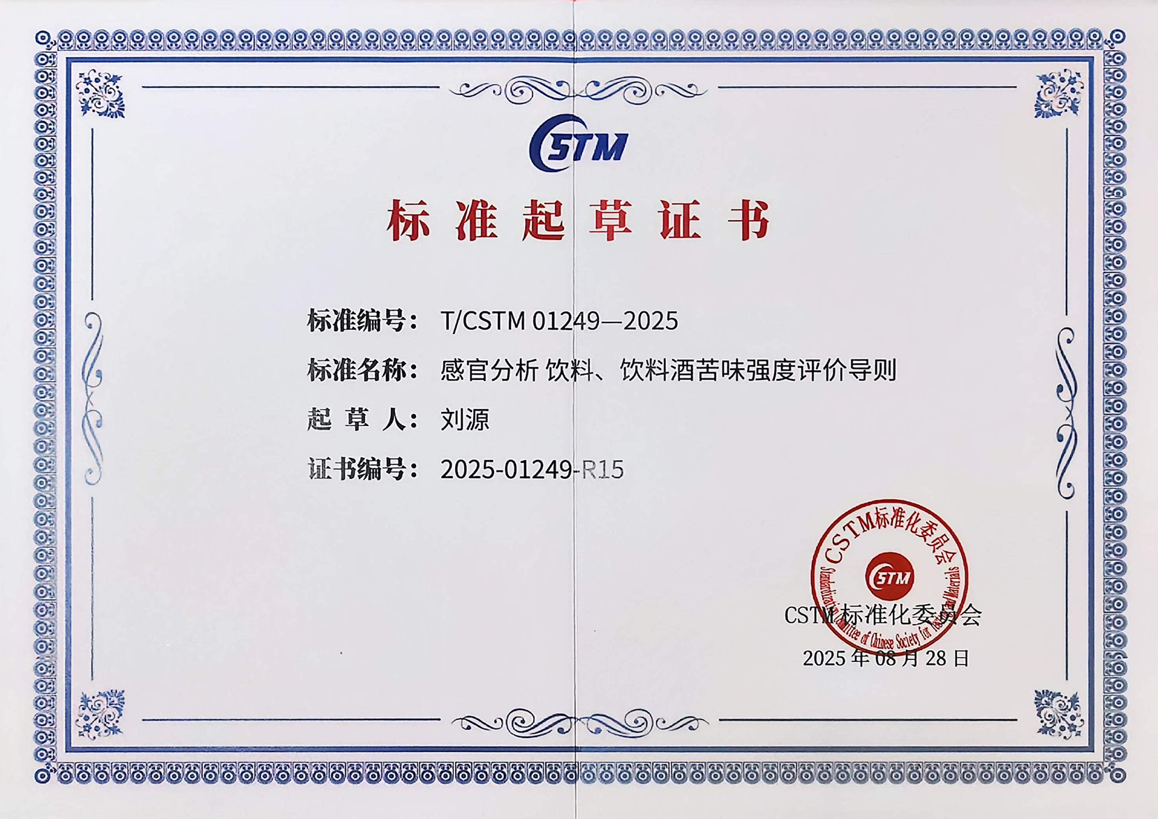 参与制定的多项团体标准经CSTM标准化委员会批准正式发布,包括《感知分析适合项勾选法》(T/CSTM 01243—2025)、《感官分析饮料湿涩强度评价导则》(T/CSTM 01250—2025)和《感官分析饮料酒苦味强度评价导则》(T/CSTM 01249—2025)等标准。
